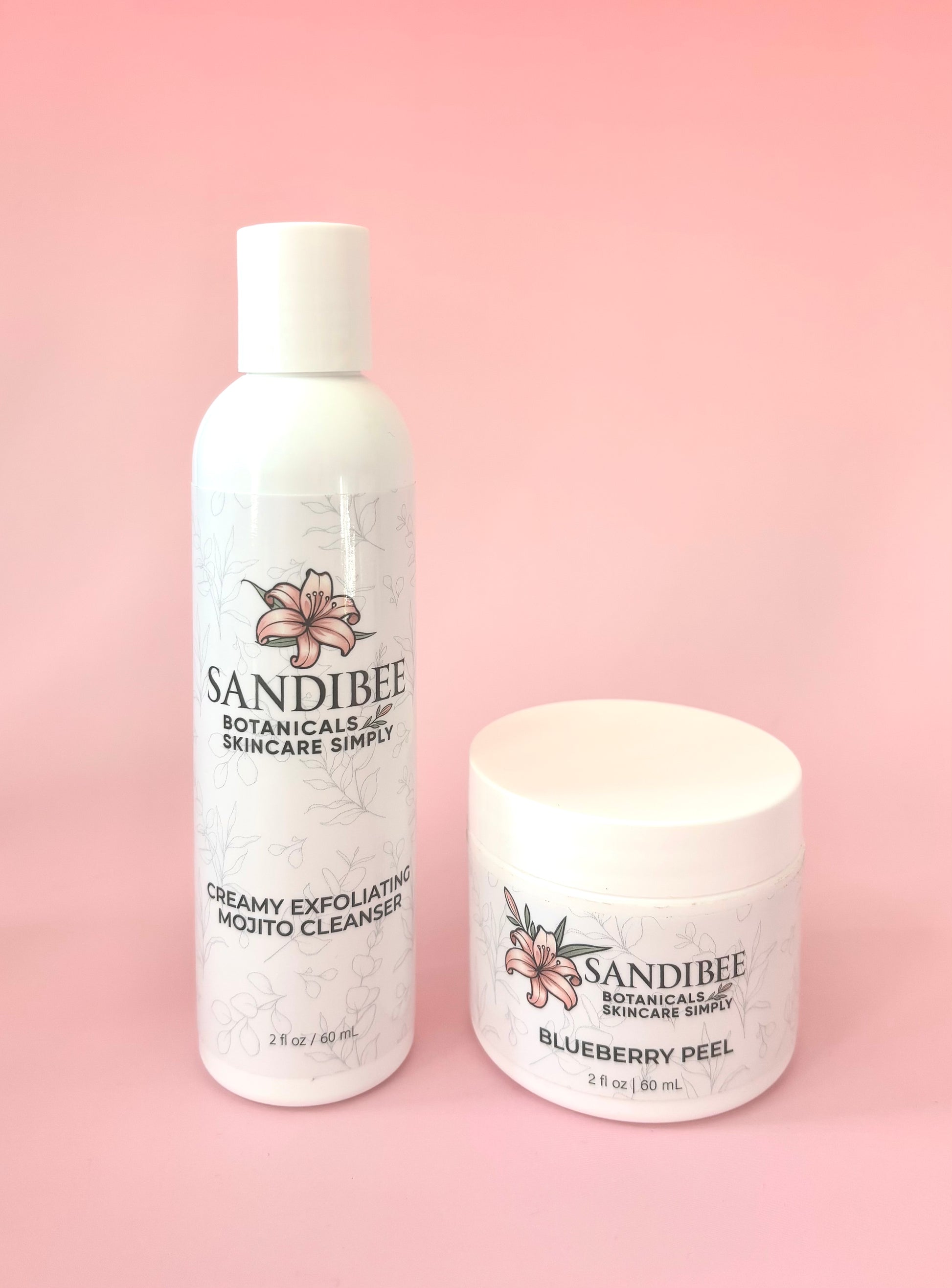 Routine: Use 1–2 times weekly depending on skin type. Begin with the Creamy Mojito Exfoliating Cleanser to gently buff away buildup and refine texture. Follow with the Blueberry Peel to resurface and brighten, letting antioxidants work their magic. Rinse, pat dry, and finish with your favorite SandiBee moisturizer for a soft, radiant glow.